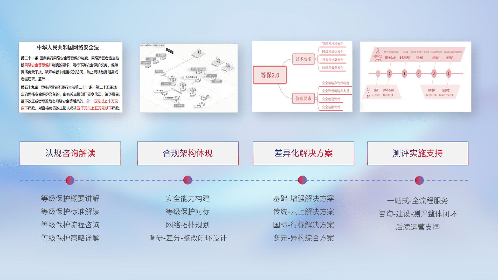 通过专业的法律咨询解读、、合规架构体现、、、、差异化解决方案、、、、测试实施支持等服务,,,为客户量身打造等保合规体系。。。。